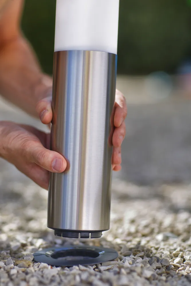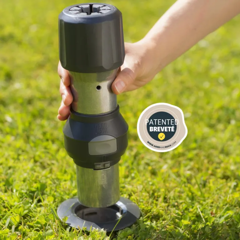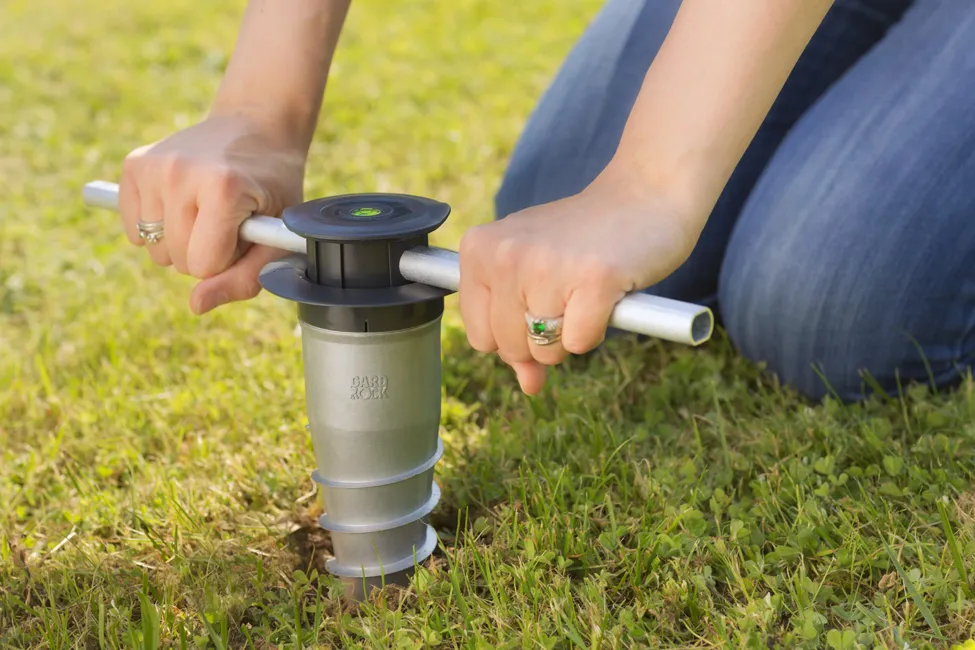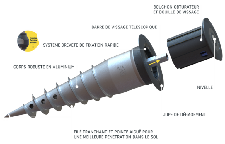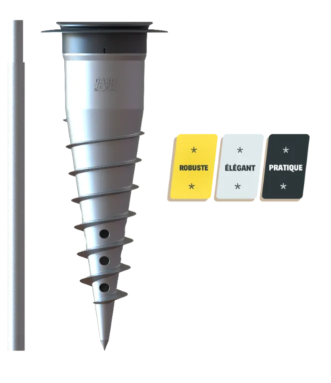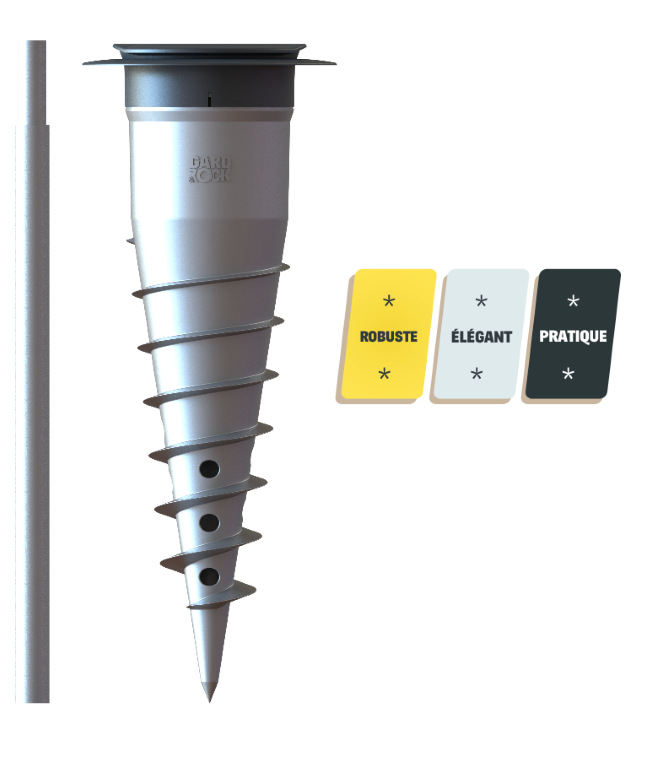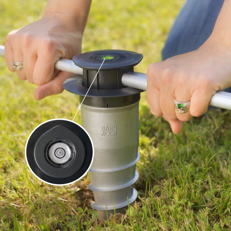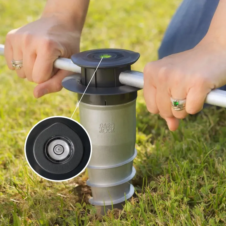 Vissez directement la base d'ancrage dans votre terrain (pelouse, massif, terre, stabilisé...) à l'aide de la barre de vissage. Le niveau à bulle intégré assurera une fixation verticale avec précision sur sols plats et même en pente! Une fois insérés, vos équipements seront bien droits. Si nécessaire selon le niveau de stabilité de votre sol, le pied de fixation Gard&Rock est également adapté pour un scellement béton. Le mode opératoire est indiqué sur la notice et nous vous invitons à visualiser cette vidéo :