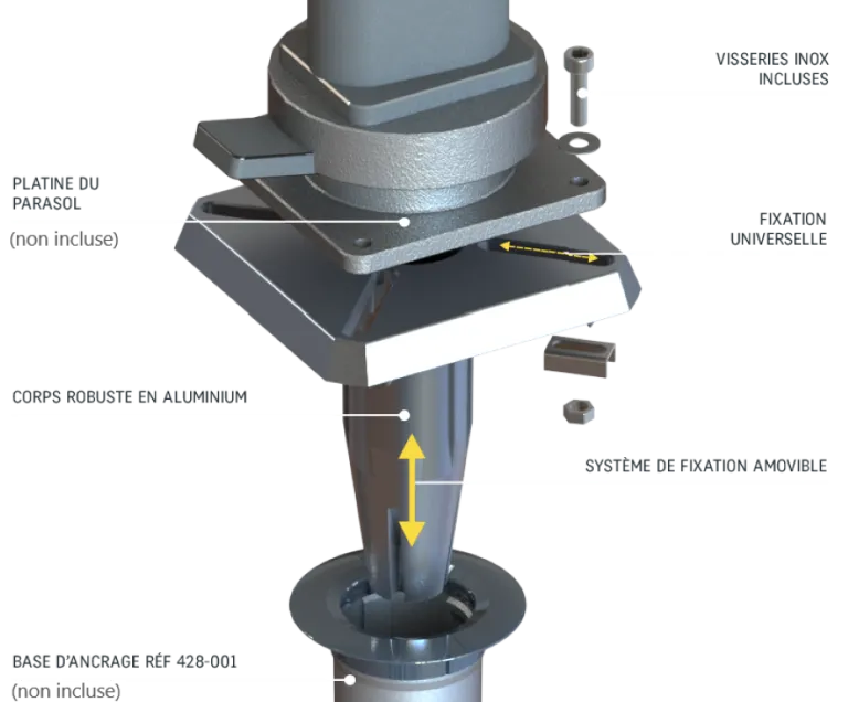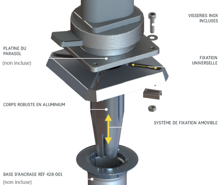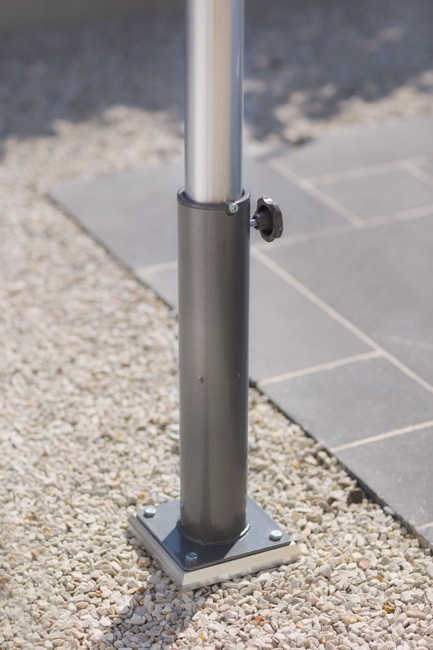 S'inscrivant dans le concept exclusif Gard&Rock, le pied pour parasol déporté devra obligatoirement être couplé sur la base d'ancrage (Ref 428-001 à commander en supplément). Ce système offre une fixation robuste, amovible et permet d'alterner ou de déplacer vos équipements pour mieux profiter de votre jardin.
